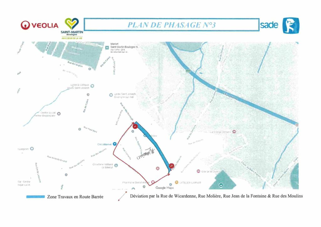 • En provenance de la route de Calais : rue des Moulins > rue Jean de la Fontaine > rue Molière > rue de Wicardenne